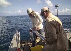 En mer, des profils bathymétriques sont effectués depuis une embarcation. L’objectif des profils bathymétriques est de suivre l’évolution du proche côtier situés dans le prolongement des profils topographiques relevés sur la plage.