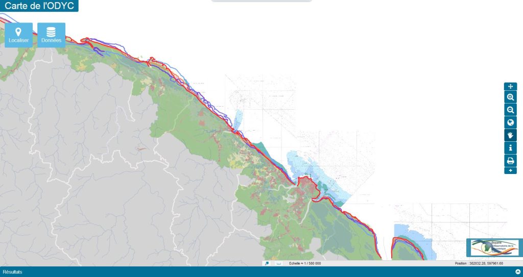 Grâce à l’interface cartographique de l’ODyC développée sous GéoGuyane, découvrez de nombreuses données pour mieux comprendre la dynamique du littoral guyanais : carte interactive ODyC.