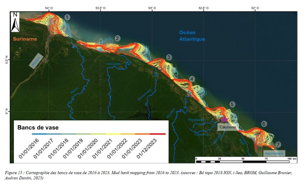 Cette approche permet de produire des cartographies régulières de la position et de la migration des bancs de vase le long de la côte guyanaise.