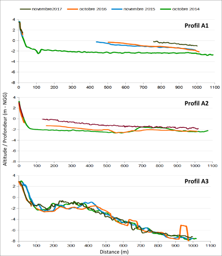 Les proches fonds côtiers ont connu également une accrétion d’environ + 0,9 m, en lien avec l’avancée du banc de vase.