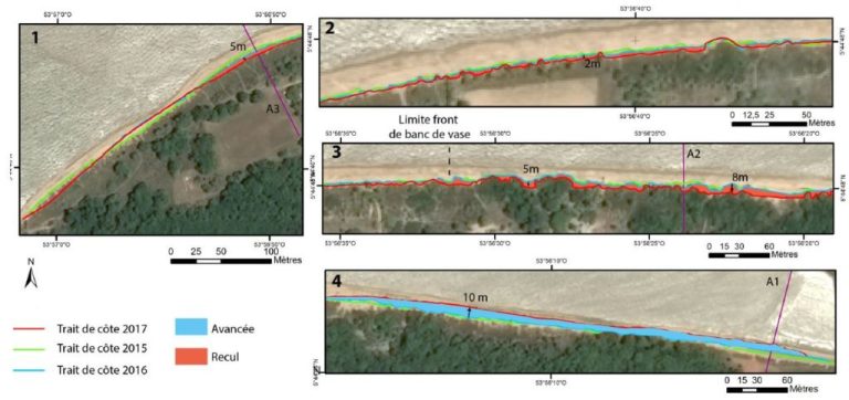 En se rapprochant de l’estuaire du Maroni, le trait de côte est plus variable. Au centre de la zone d’étude, le recul du trait de côte s’est accompagné d’un abaissement du haut de plage. À l’ouest, les levés topo-bathymétrique montre une érosion généralisée.