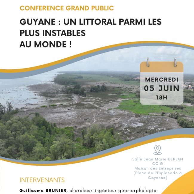 Dans le cadre du séminaire des 10 ans de l’Observatoire de la Dynamique Côtière de Guyane du 3 au 5 juin 2024, une conférence grand public est organisé ce mercredi 5 jui